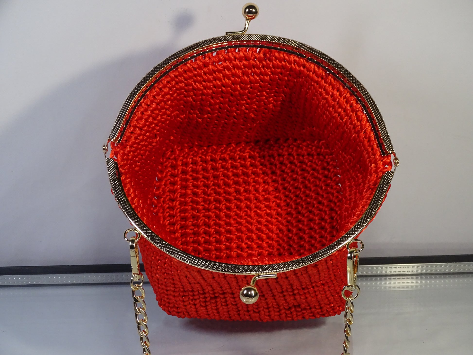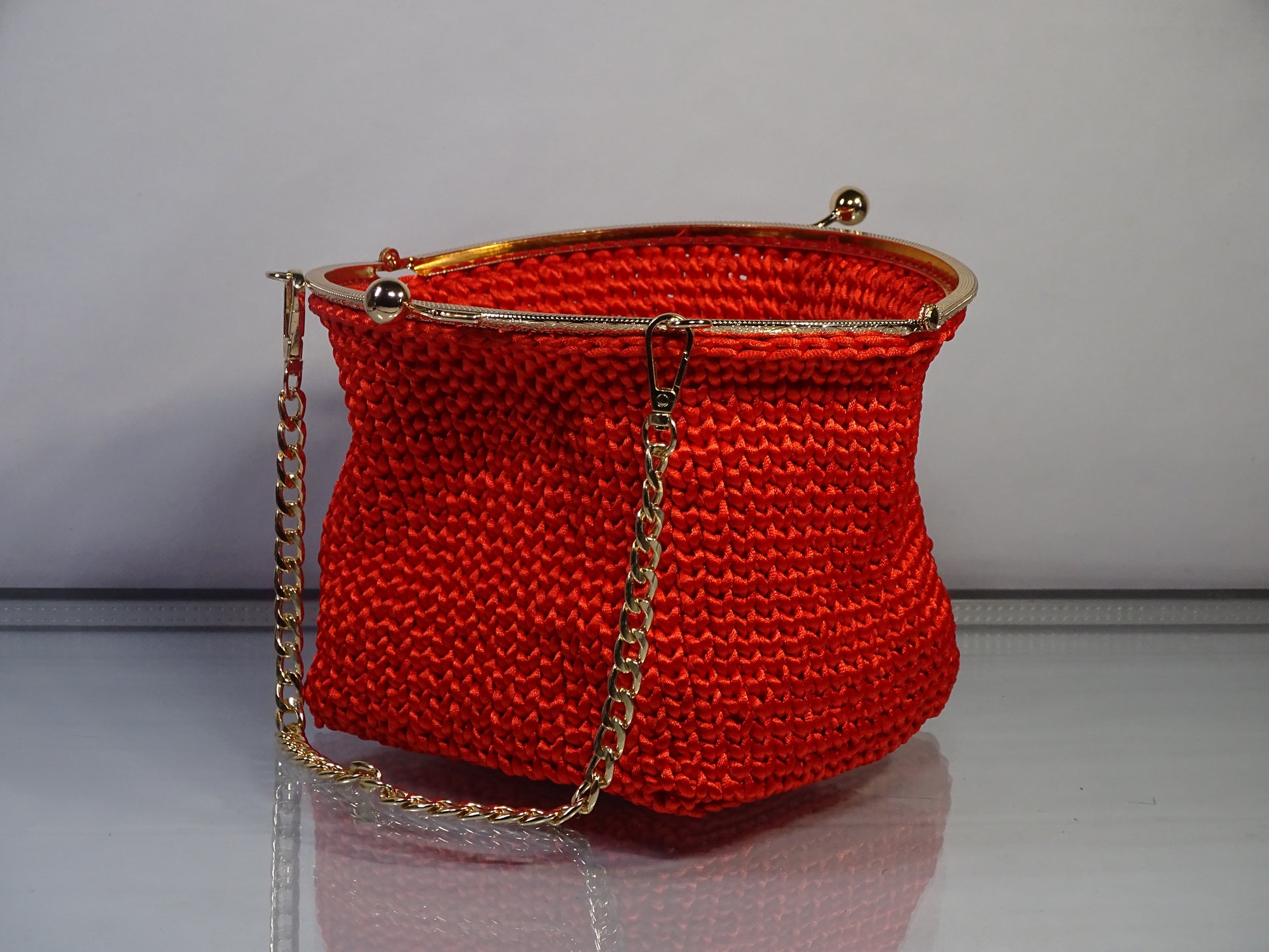 Teixida a mà en punt crochet de fil satinat vermell intens, la Flamenca Rouge és una declaració d'intencions. La seva estructura rodona i generosa — capaç d'allotjar un smartphone i tots els teus essencials — es corona amb un tancament kiss-lock en metall daurat, aquell detall vintage que converteix una bossa en una peça de col·lecció.